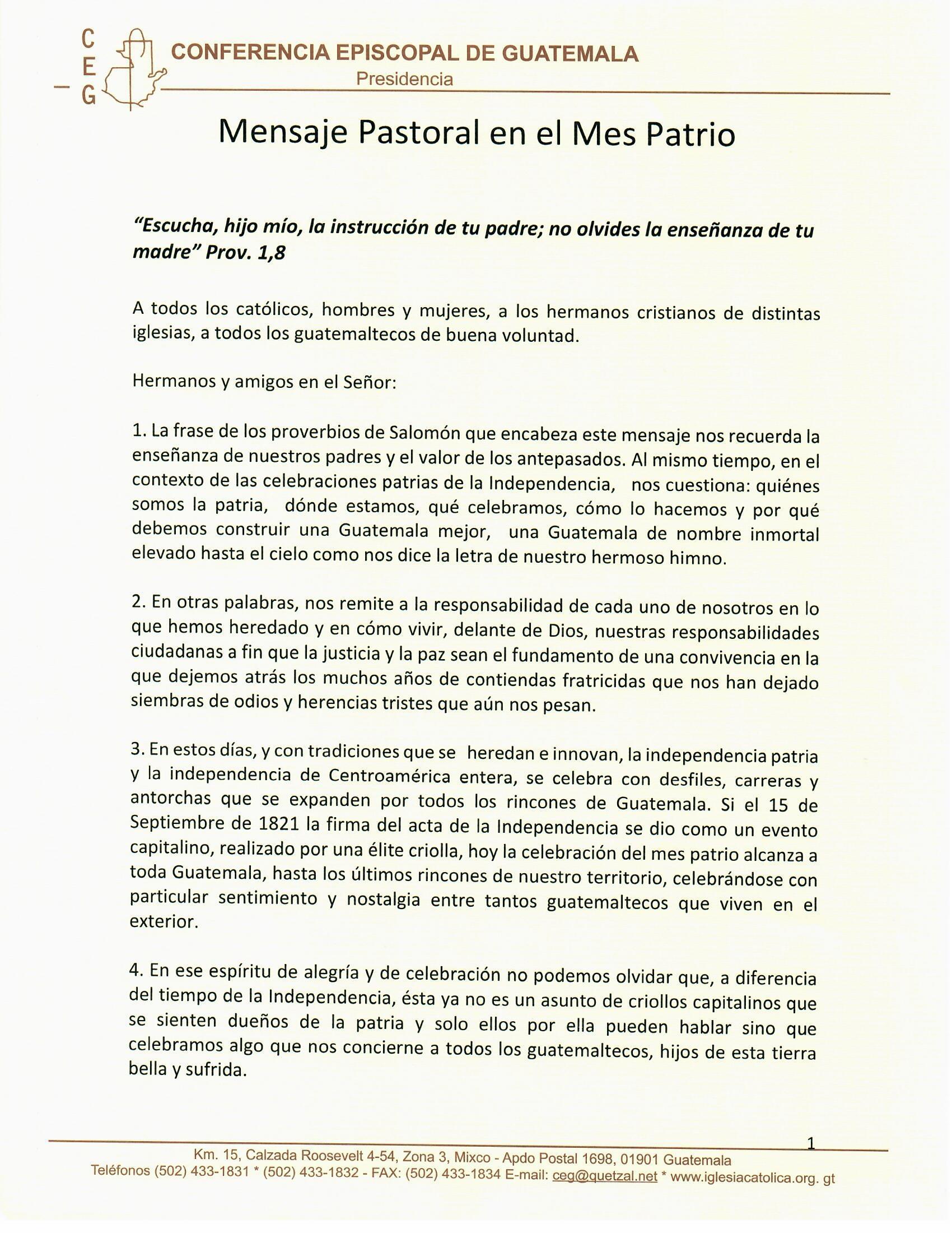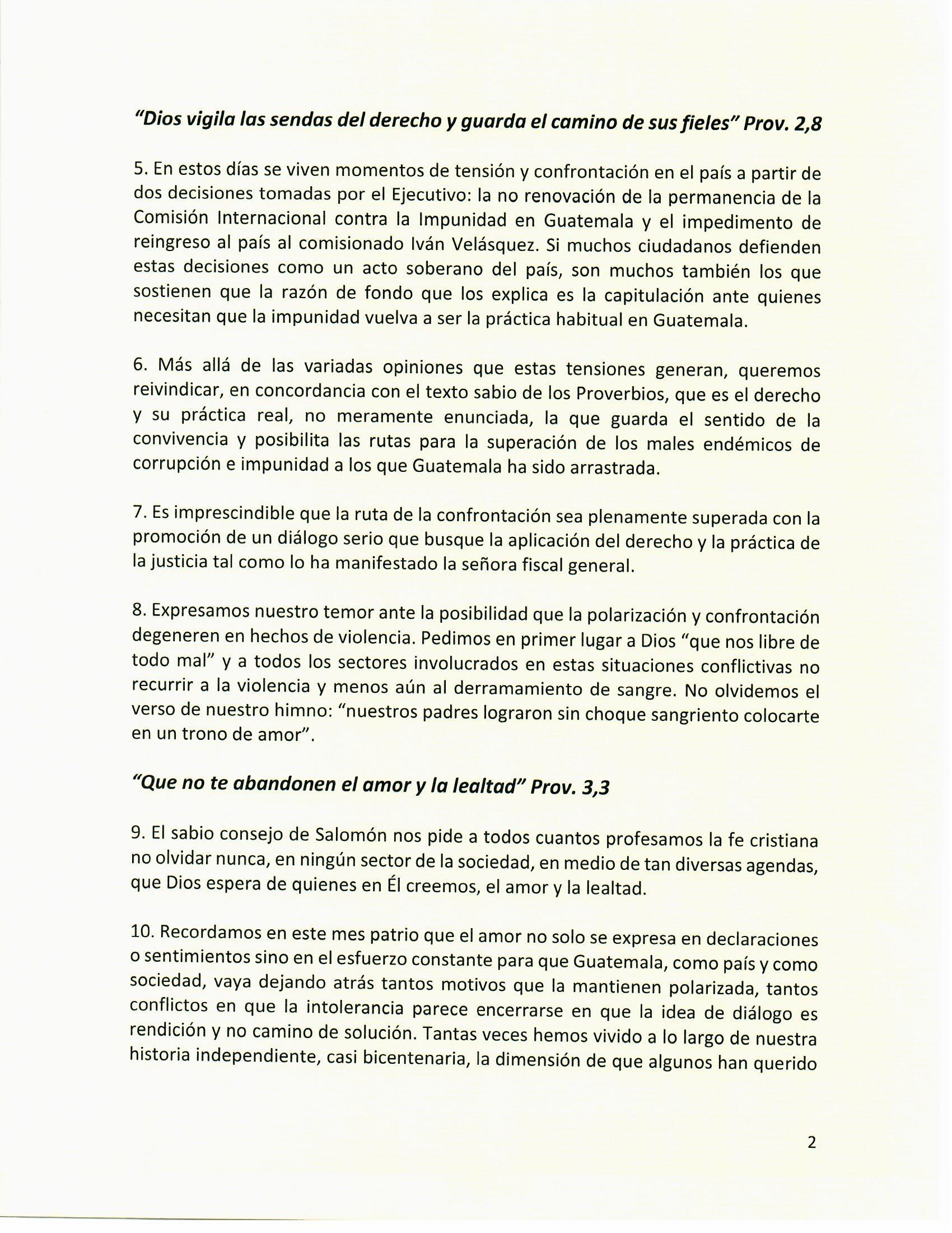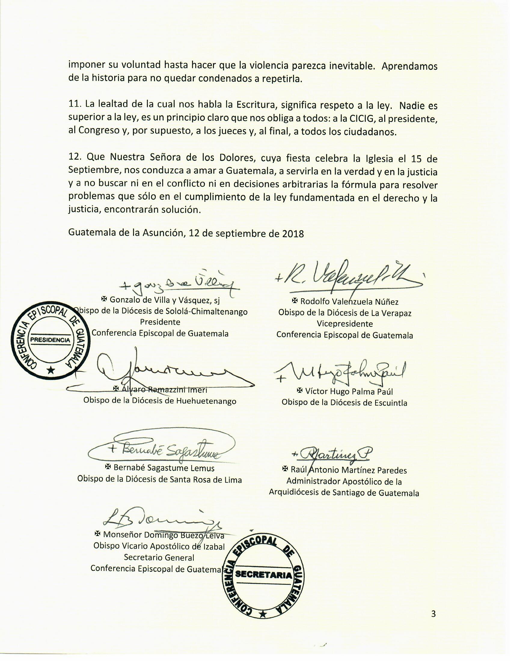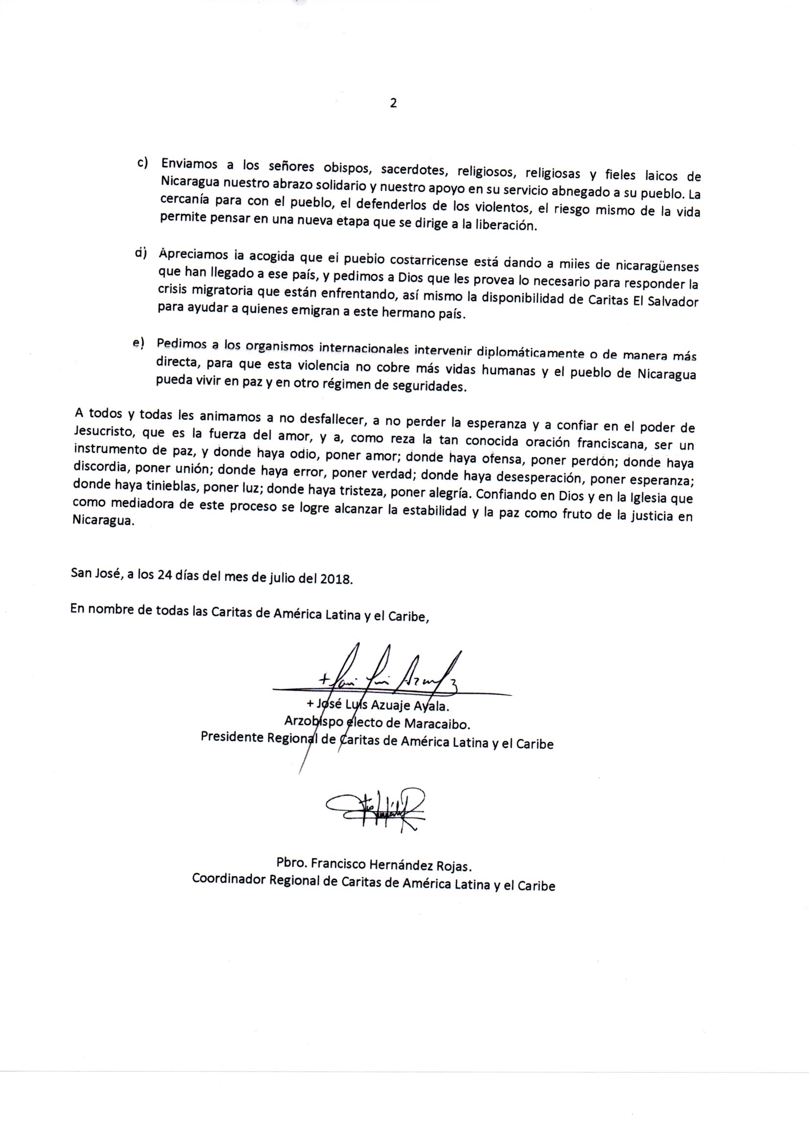 A todos y todas les animamos a no desfallecer, a no perder la esperanza y a confiar en el poder de Jesucristo, que es la fuerza del amor, y a, corno reza la tan conocida oración franciscana, ser un instrumento de paz, y donde haya odio, poner amor; donde haya ofensa, poner perdón; donde haya discordia, poner unión; donde haya error, poner verdad; donde haya desesperación, poner esperanza; donde haya tinieblas, poner luz; donde haya tristeza, poner alegría. Confiando en Dios y en la Iglesia que como mediadora de este proceso se logre alcanzar la estabilidad y la paz como fruto de la justicia en Nicaragua.