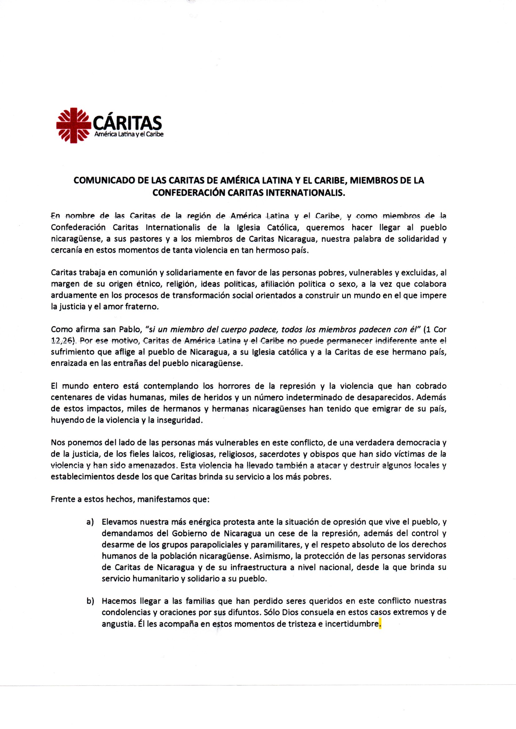 Como afirma san Pablo, «si un miembro del cuerpo padece, todos los miembros padecen con él” (1 Cor 12,26). Por ese motivo, Caritas de América Latina ¡[el Caribe m puede permanecer indiferente ante el sufrimiento que aflige al pueblo de Nicaragua, a su Iglesia católica y a la Caritas de ese hermano país, enraizada en las entrañas del pueblo nicaragüense.